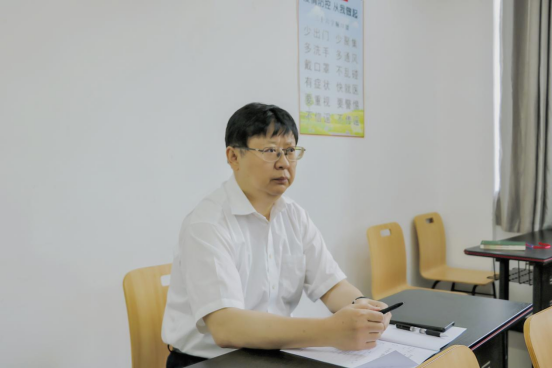 褚光荣认真记录刘敏副教授的授课内容、教学方法和教学效果,细心观察同学们的精神面貌和学习状态。