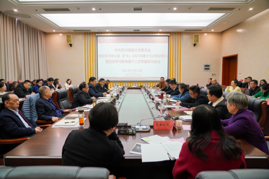 12月10日,贵州民族大学党委理论学习中心组(扩大)召开“2021年第17次集中学习暨党史学习教育第12次专题学习会”,专题学习了党的十九届六中全会精神和省委十二届十次全会精神。校党委书记褚光荣主持会议并讲话,校党委副书记、校长王林作主题发言。校领导张鹏程、杨声国、熊元、周杰、吴嶷晖、任达森、黄其松,校党委委员奉振、任洁参加学习。