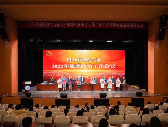 12月21日,贵州民族大学2021年思想政治工作会在大学城校区学生活动中心礼堂召开,校党委书记褚光荣出席并讲话,校党委副书记、校长王林主持会议。校领导张鹏程、杨声国、熊元、周杰、任达森、黄其松以及校党委委员奉振、任洁出席。各职能部门负责人,学院党政主要负责人,全体辅导员、教师代表、学生代表近400人参会。