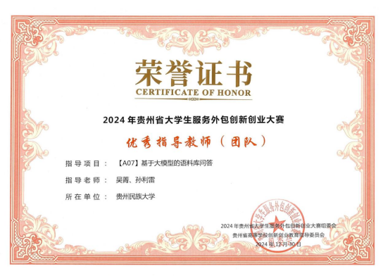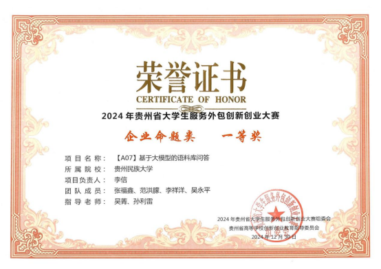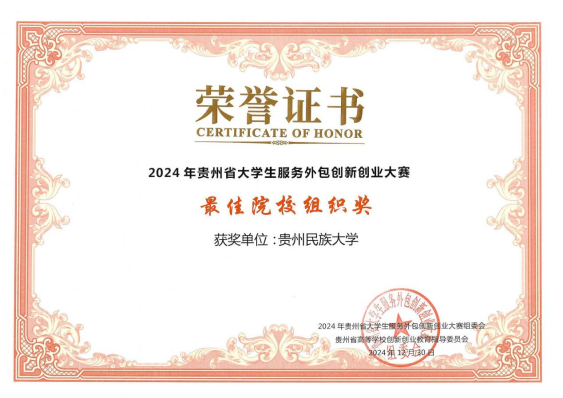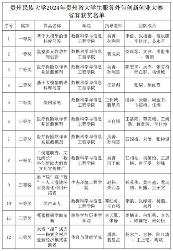 近日,由贵州省高等学校创新创业教育指导委员会主办的2024年贵州省大学生服务外包创新创业大赛结果公布,我校学子在大赛中奋勇拼搏,取得了优异的成绩。其中2个项目获得一等奖,3个项目获得二等奖,7个项目获得三等奖,全省高校共65奖项,我校斩获12项。黄成泉、吴菁、孙利雷三位项目老师获得优秀指导教师奖,我校凭借有力的组织工作和优异的参赛成绩获最佳院校组织奖。