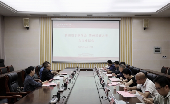 交流座谈会在南校区行政楼第七会议室举行,会议由唐建荣主持。贵州省水家学会会长韦祖宏、常务副会长兼秘书长蒙明洲、副会长杨婉丽,贵州民族大学公共关系处(校友办)处长赵湛娇、水书文化研究院原副院长潘朝霖以及相关学院教师代表等参加。