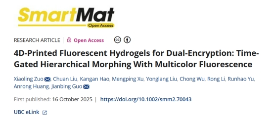 近日,我校材料科学与工程学院左晓玲副教授在材料类顶级期刊《SmartMat》(智能材料杂志)(SCI,IF=12.8,中国科学院1区Top)发表题为“4D-printed fluorescent hydrogels for dual-encryption:Time-gated hierarchical morphing with multicolor fluorescence”《用于双重加密的4D打印荧光水凝胶:具有多色荧光的时间门控分级变形》(DOI:10.1002/smm2.70043)的学术研究论文。