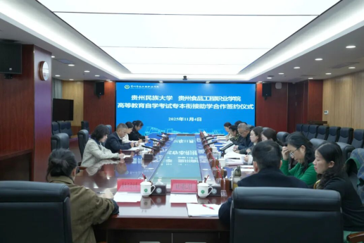 11月4日,贵州民族大学与贵州食品工程职业学院高等教育自学考试专升本衔接助学合作签约仪式在贵州食品工程职业学院举行。贵州民族大学党委常委、副校长龚维,贵州食品工程职业学院党委副书记、院长杜平出席签约仪式并讲话。会议由贵州食品工程职业学院党委委员、副院长刘丹主持。