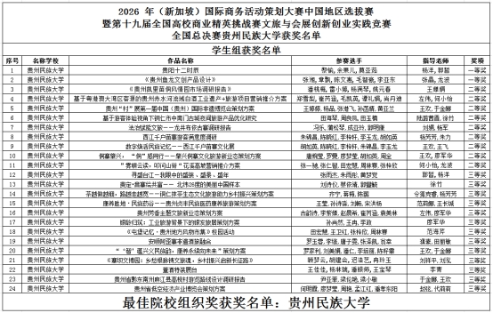 作为商科顶尖赛事,捷报频传的背后,是我校创新创业教育成果的生动体现,更是学校人才培养质量的有力印证。未来,学校将以此次赛事为契机,持续深化创新创业教育改革,着力培养更多兼具创新精神与实践能力的高素质人才,为贵州文旅产业发展与乡村振兴注入更多智力支持与青春力量。