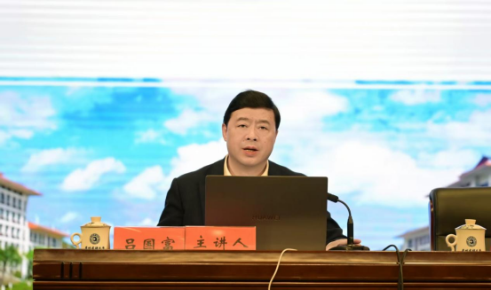 报告会上,吕国富紧密围绕核心主题,深度解读习近平总书记在党的二十届四中全会上的重要讲话精神与全会《建议》核心要义。报告从全会召开的时代背景、重大意义切入,系统铺陈其擘画的“十五五”发展宏伟蓝图,结合高等教育发展趋势、民族发展需求及学校办学实际,层层递进,详细解读“十五五”时期经济社会发展的指导思想、重大原则、核心目标、战略任务、关键举措与根本保证,同时明确贯彻落实全会精神的核心着力点。整场报告逻辑严谨、内涵厚重,兼具理论深度与实践指导性,极具感召力。
