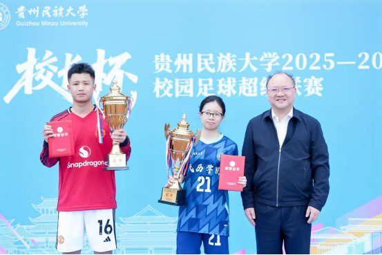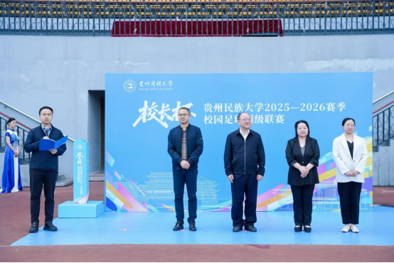 4月17日下午,贵州民族大学2025-2026赛季“校长杯”校园足球超级联赛决赛暨颁奖仪式在南校区体育场举行。校长、党委副书记吴一文,校党委副书记杨楠、蒋雪明,校党委常委、副校长徐国敏及相关职能部门负责人出席,并为获奖队伍颁奖。颁奖仪式由校团委书记胡斌主持。